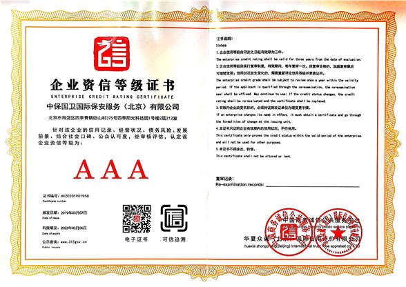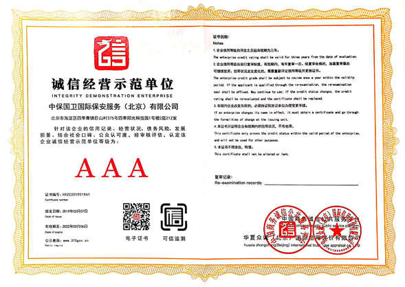 企業(yè)信用等級(jí)證書AAA級(jí)